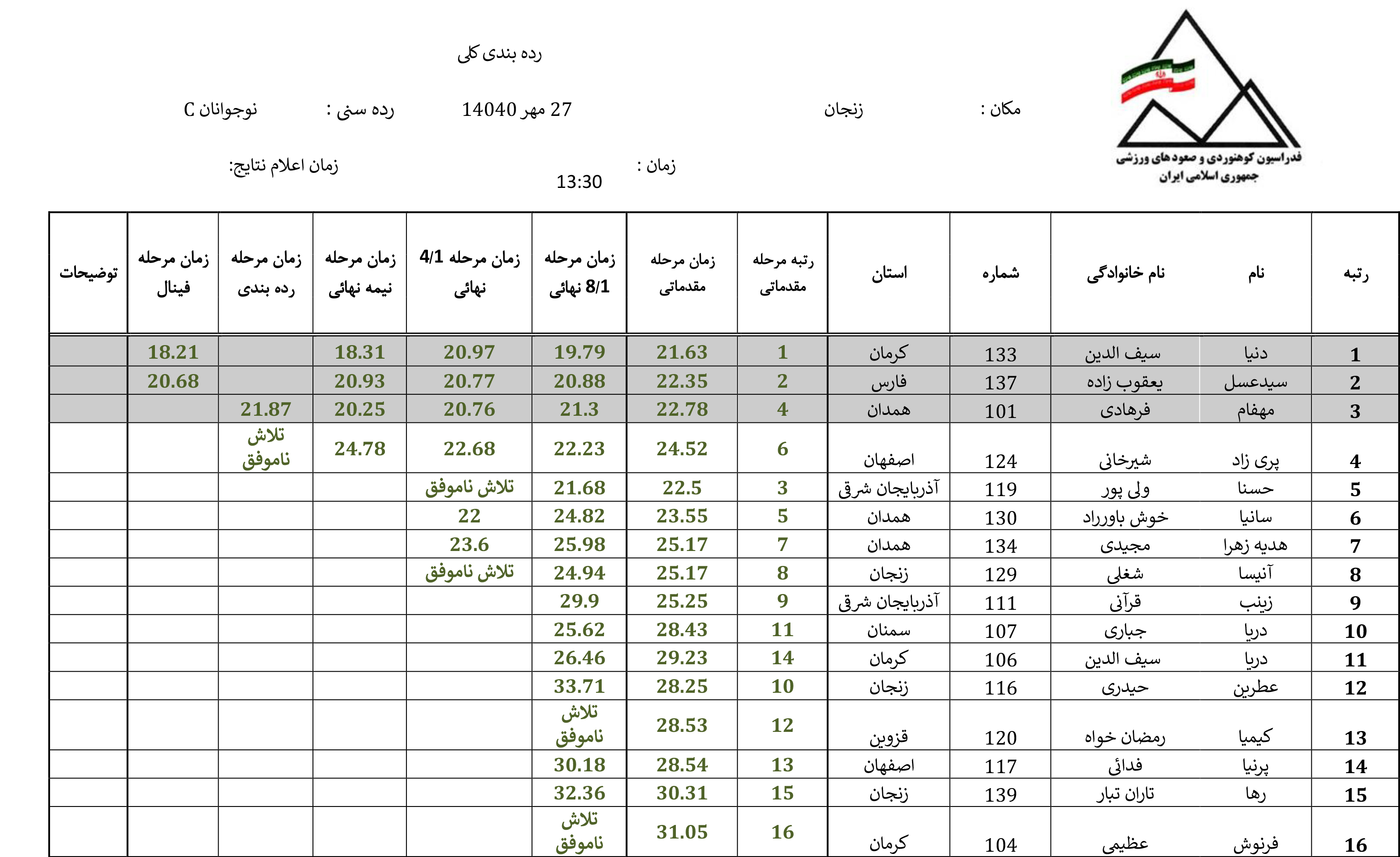نتایج هفتمین دوره مسابقات سنگ‌نوردی المپیاد استعدادهای برتر کشور در زنجان